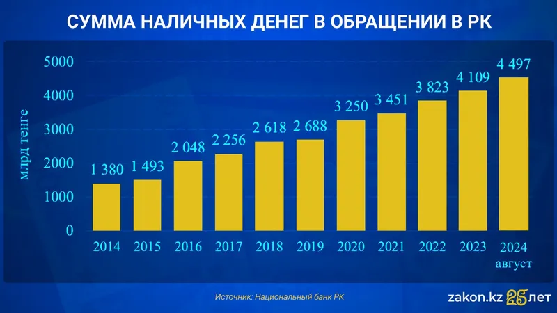 Отмечается, что сумма наличных денег в обращении в Казахстане на конец августа 2024 года составляла 4,5 трлн тенге, увеличившись с начала года на 458 млрд тенге, или 11,3%. При этом среднегодовой темп роста наличных денег в обращении с 2014 по 2024 год составлял 13%.