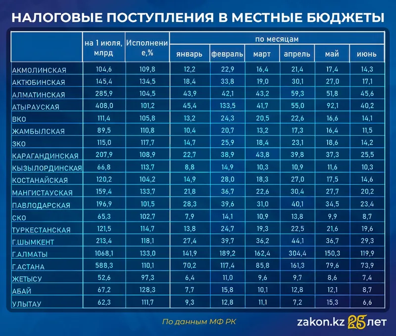 - Атырауская область. Ключевой нефтегазовый регион страны принес в бюджет 408,0 млрд тенге. При этом исполнение плана составило 101,2%, что свидетельствует о стабильности в добывающем секторе.