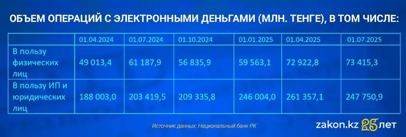 По информации Нацбанка, объем операций с использованием электронных денег в пользу индивидуальных предпринимателей и юридических лиц по сравнению со вторым кварталом 2024 года вырос на 21,8%, в пользу физических лиц рост составил 20%.