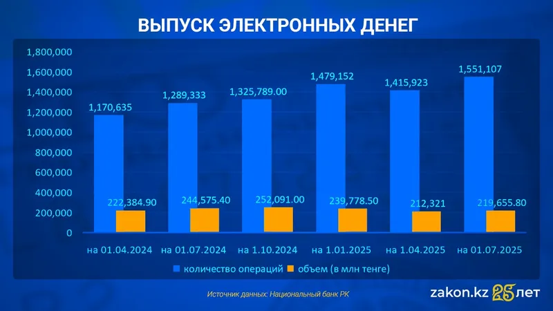 С апреля по июль 2025 года количество операций по выпуску электронных денег увеличилось с 1,41 млн до 1,55 млн операций, а их объем вырос на 3,5%, составив 219,6 млрд тенге против 212,3 млрд тенге по данным на 1 апреля, согласно статистике Национального банка РК.