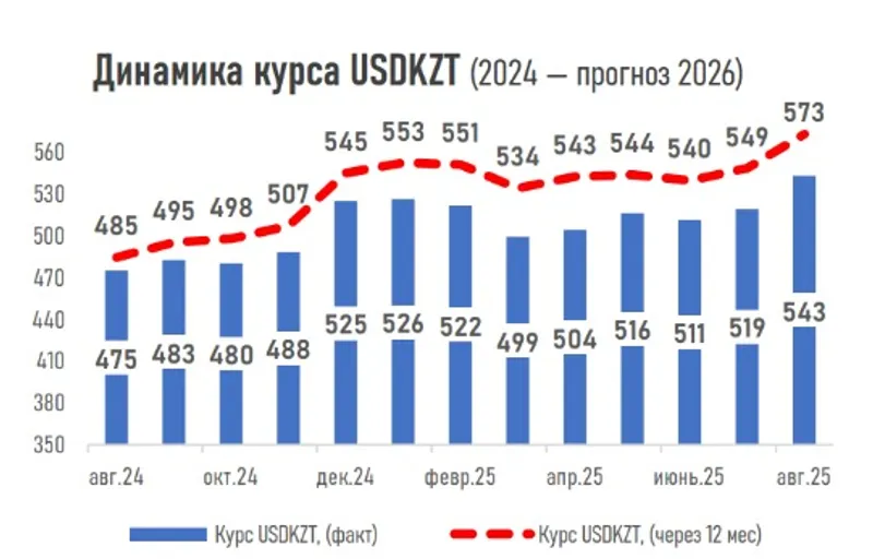 К началу сентября курс по паре USD/KZT прогнозируется на уровне 541,7 тенге за доллар, а через год на отметке 573 тенге. Для сравнения: в предыдущем прогнозе 523,4 и 548,5 тенге соответственно.