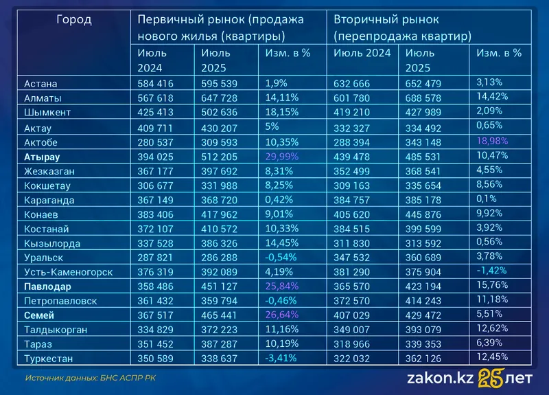 От Алматы до Кокшетау: сколько стоил квадратный метр жилья в июле 2025 года
