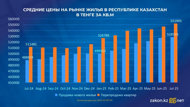Согласно данным Бюро нацстатистики, в июле 2025 года средние цены на первичное жилье выросли незначительно по сравнению с июнем – всего на 0,25%, до 528 559 тенге на квадратный метр. Для сравнения, месяцем ранее рост составлял более 1%.