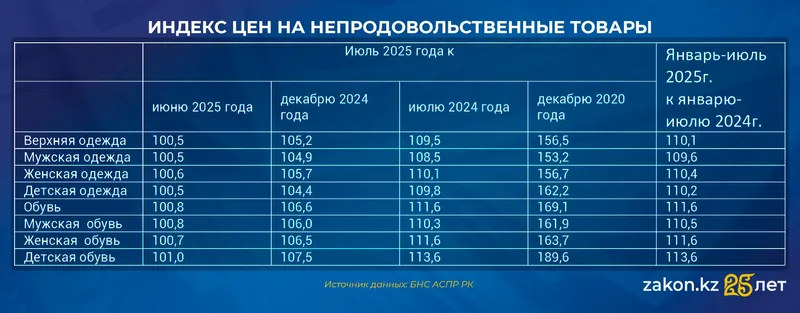 В июле 2025 года в Казахстане продолжился рост цен на непродовольственные товары, хотя его темпы по сравнению с предыдущим месяцем были умеренными. По данным Бюро нацстатистики, в среднем по категории индекс цен вырос на 0,8% к июню 2025 года и на 9,5% к июлю прошлого года. Всего за январь-июль 2025 года рост непродтоваров достиг 9% по сравнению с аналогичным периодом 2024-го.