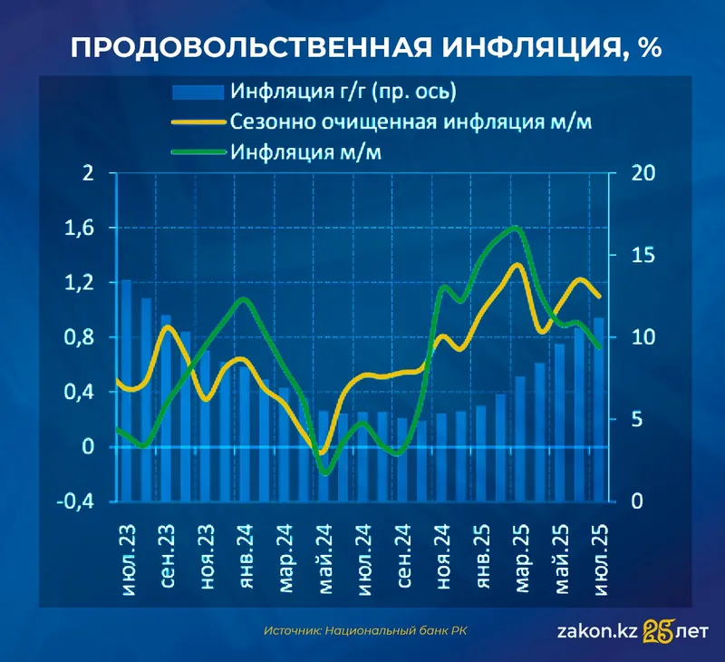 В июле годовая продовольственная инфляция ускорилась до 11,2%, а месячный рост составил 0,7%, согласно данным Национального банка РК.