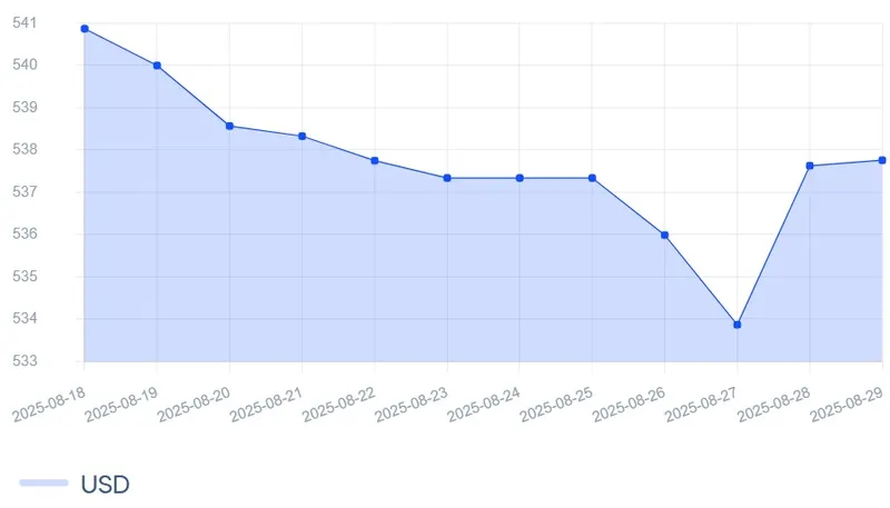 По итогам дневных торгов в пятницу, 29 августа, средневзвешенный курс доллара составил 538,6 тенге, поднявшись на 0,77 тенге, практически не отреагировав на сегодняшнее решение по базовой ставке.