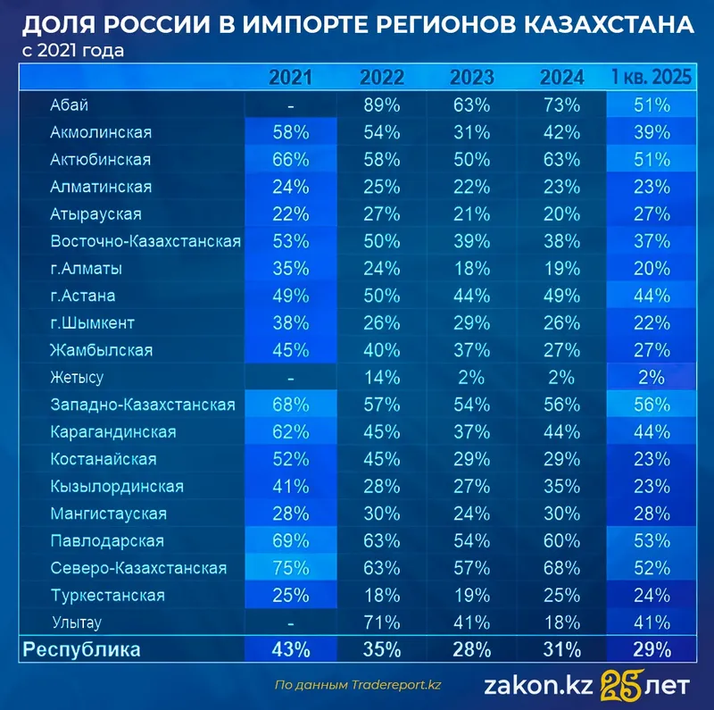 "В целом Казахстан движется в сторону снижения зависимости от российских поставок, однако разрыв в динамике между регионами показывает, что процесс диверсификации развивается неравномерно и будет требовать дополнительных усилий для сбалансированного эффекта".Tradereport.kz
