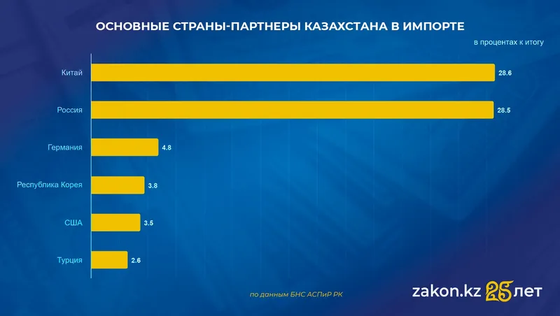 Анализ внешней торговли показывает, что, несмотря на сокращение своей доли, Россия остается одним из двух ключевых поставщиков для Казахстана. При этом в первой половине 2025 года главным партнером по импорту стал Китай, чья доля достигла 28,6%, опередив Россию с ее 28,5%. На третьем месте со значительным отрывом находится Германия с долей 4,8%. Это подчеркивает, что Казахстан остается в сильной зависимости от двух гигантских рынков.