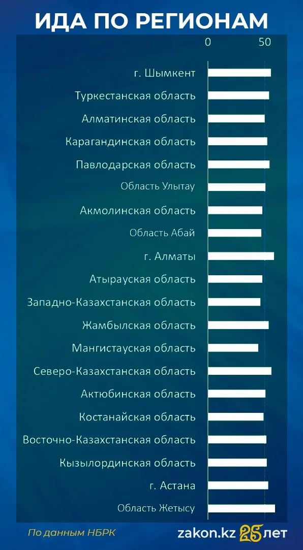 Согласно данным НБРК, деловая активность по регионам Казахстана также демонстрирует существенные различия. В августе большинство регионов страны находились в зоне роста. Лидерами по деловой активности стали Шымкент, Алматинская область и область Жетысу. В положительной зоне также находятся крупнейшие города – Алматы и Астана.