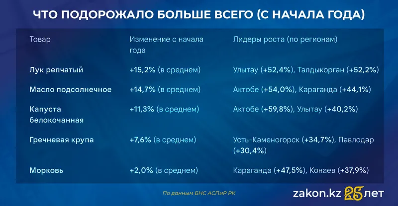 Несмотря на общую стабилизацию, рост цен с начала года был весьма существенным. Наибольший скачок зафиксирован на лук репчатый, который в некоторых регионах, например в области Улытау (152,4%) и Талдыкоргане (152,2%), подорожал более чем на 50%. Значительный рост также показали морковь (в Караганде 147,5%) и подсолнечное масло (в Актобе 154,0%).