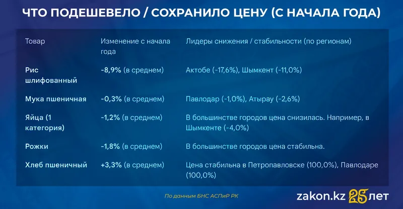В то же время некоторые товары, включая пшеничную муку первого сорта и рис, демонстрируют стабильность или даже снижение цен в течение года. Например, мука в Павлодаре подешевела (99%), а рис в Астане – на 9% (91,1%).