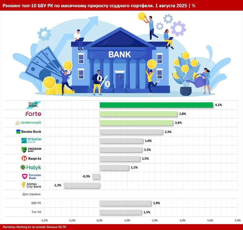 Лидер по месячному росту ссудного портфеля среди БВУ топовой десятки – Bank RBK: плюс 4,1%, до 1,3 трлн тенге. С начала года фининститут нарастил портфель займов на 13,5%. Bank RBK активно кредитует как население, так и бизнес, в том числе малый и средний, предлагая доступное финансирование и участвуя в ключевых государственных программах поддержки предпринимателей совместно с фондом "Даму". Так, к примеру, в рамках новой программы "Өрлеу" предприниматели получают льготное финансирование в приоритетных отраслях экономики на срок до 10 лет, а по механизму программы портфельного гарантирования – гарантию от "Даму" в размере до 85% от суммы займа в пределах 3,5 млрд тенге.