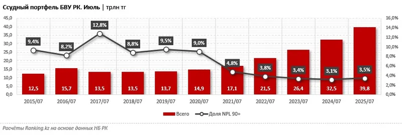 Для справки: за год ссудный портфель БВУ РК увеличился на 22,7%, за пять лет – в 2,7 раза, а за десятилетие – уже в 3,2 раза. Доля просроченной более 90 дней задолженности NPL 90+ к августу текущего года в среднем по сектору составила всего 3,5%.