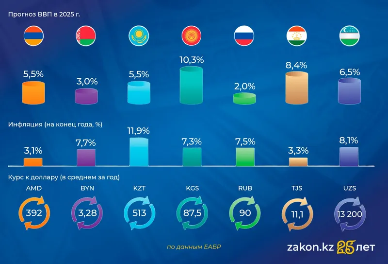 Темпы ослабления или укрепления национальных валют к доллару США в первой половине 2025 года остаются в целом прогнозируемыми: тенге – 513, рубль – 90, сум – 13 200, киргизский сом – 87,5, армянский драм – 392, таджикский сомони – 11,1, белорусский рубль – 3,28. В Центральной Азии валютная стабильность обеспечивается высокими ценами на сырье, поддержкой денежных переводов и строгим валютным регулированием.