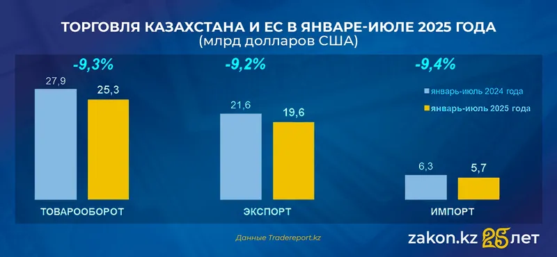 Снижение затронуло как экспорт, так и импорт. Поставки из Казахстана в Европу упали на 9,2%, до 19,7 млрд долларов, а импорт из стран Европы сократился на 9,4%, до 5,7 млрд долларов.