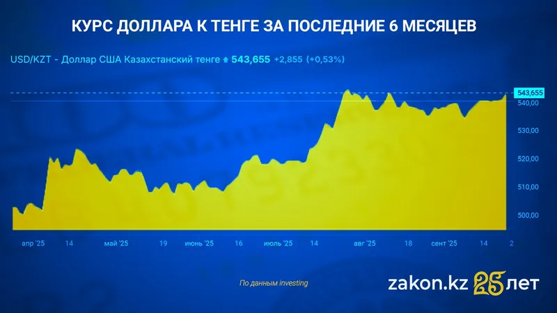 Аналитики прогнозируют, что в последнюю неделю сентября курс доллара к тенге будет колебаться в диапазоне 542-544 тенге за доллар. По данным Apecon, ожидается стабильность курса с минимальными колебаниями от 541 до 545 тенге, а средний курс составит около 542 тенге. В начале недели возможен небольшой рост до 544 тенге за доллар.