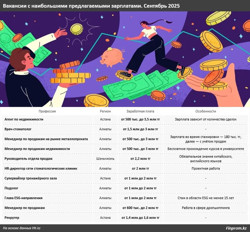 Судя по открытым данным рекрутинговых площадок, рынок труда сегодня не предлагает вышеуказанные высокие зарплаты. Вероятно, специалистов, чья работа оценивается в такие суммы, не "хантят" в интернете, а "перекупают" в других компаниях или взращивают внутри из перспективных сотрудников. Согласно анализу предложений на портале Hh.kz, потолок заработных плат в вакансиях – 3-3,5 млн тг.