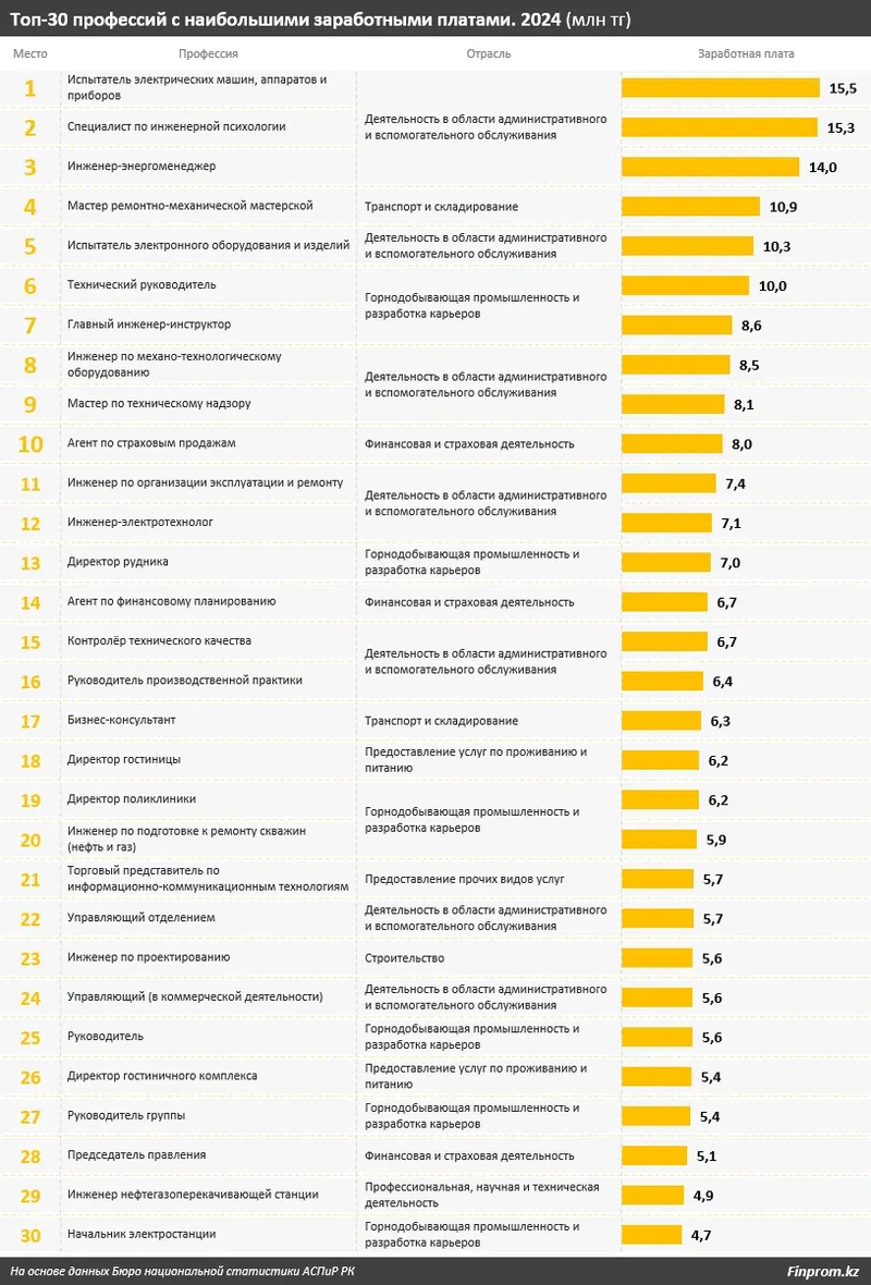 В первую десятку вошли профессии с зарплатой от 8 млн до 15 млн тг. Как пишут авторы рейтинга, в списке нет ни одного чиновника, в него входит всего один руководитель, а остальные – специалисты узкого профиля. Лидер – испытатель электрических машин, аппаратов и приборов. Он и получает 15,5 млн тг в месяц. Его сосед в рейтинге – эксперт по инженерной психологии с заработком в 15,3 млн тг. Этот специалист применяет знания и методы психологии для оптимизации процессов проектирования, разработки и использования технических систем, оборудования и интерфейсов. И около 14 млн тг можно зарабатывать в должности инженера-энергоменеджера.