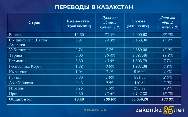 Главным источником переводов является Россия, откуда поступило 4,9 млрд тенге (23,5%). Далее следуют США с 3,2 млрд тенге (15,2%) и Узбекистан с 2,7 млрд тенге (12,9%). За ними идут Турция (2,3 млрд тенге, 11,2%) и Германия (1,6 млрд тенге, 7,7%).