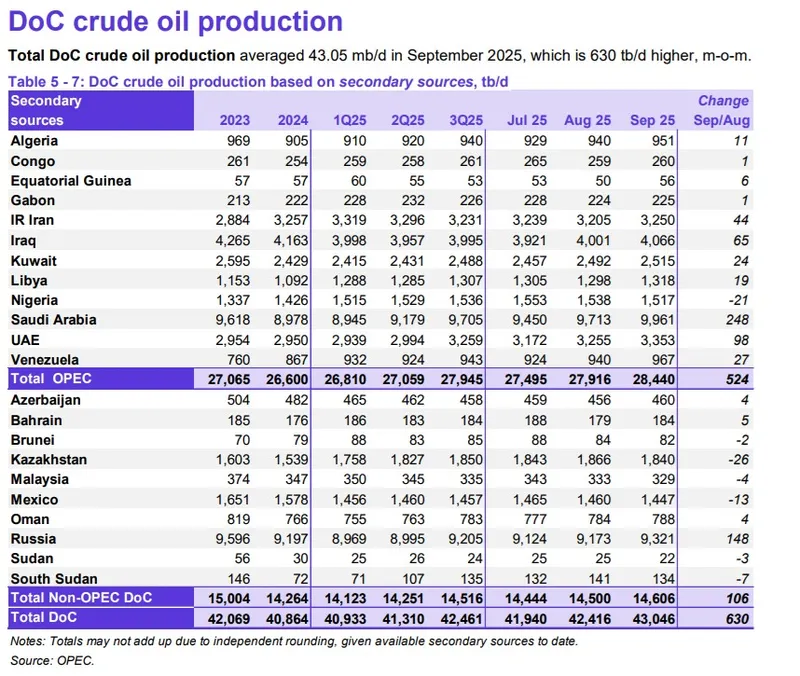Без учета Ливии, Ирана и Венесуэлы, освобожденных от участия в соглашении, совокупная добыча составила 37,511 млн баррелей в сутки. При этом расчетный план на сентябрь предусматривал 37,844 млн, что отражает устойчивую тенденцию к консервативному исполнению обязательств большинством стран.