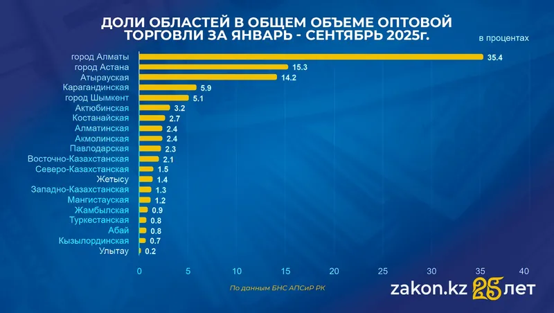 Объем оптовой торговли (66,4% от всей торговли РК) достиг 35 046,6 млрд тенге, увеличившись на 9,6% по отношению к 2024 году.