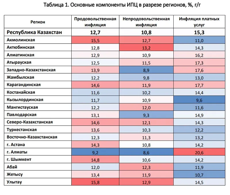 Из релиза следует, что в сентябре годовая инфляция в Казахстане составила 12,9% (в августе – 12,2%). Ускорение годовой инфляции зафиксировано в 18 регионах, замедление – в 1, а сохранение на прежнем уровне – в 1 регионе.