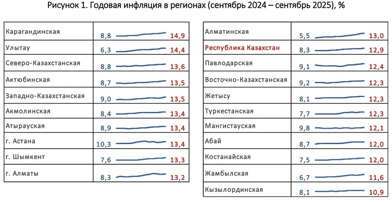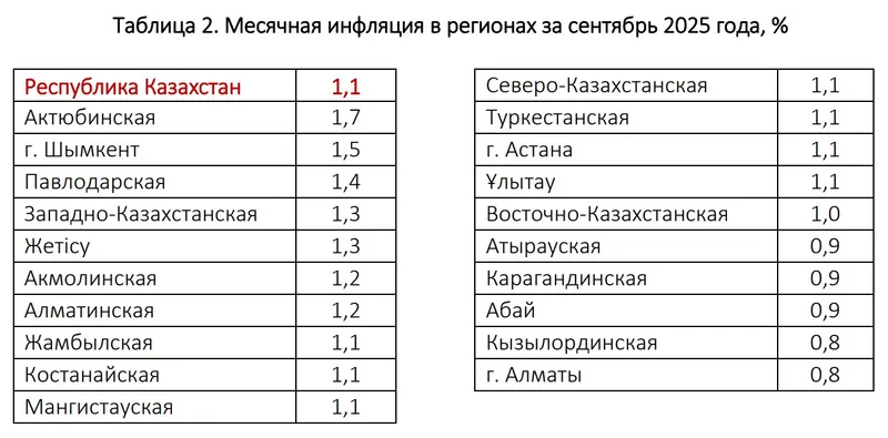 "По итогам сентября рост цен на непродовольственные товары составил 10,8% в годовом выражении (в августе – 9,7%). Максимальное значение зафиксировано в Актюбинской области (13,2%), минимальное – в Алматы (8,6%)".Пресс-служба НБК
