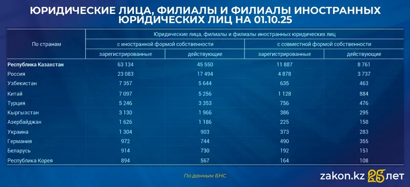 Общий приток иностранных компаний, по данным БНС АСПиР РК, в 2025 году замедлился: прирост числа юридических лиц с полной иностранной собственностью составил 6,6%, что ниже показателя предыдущего года (7,4%).