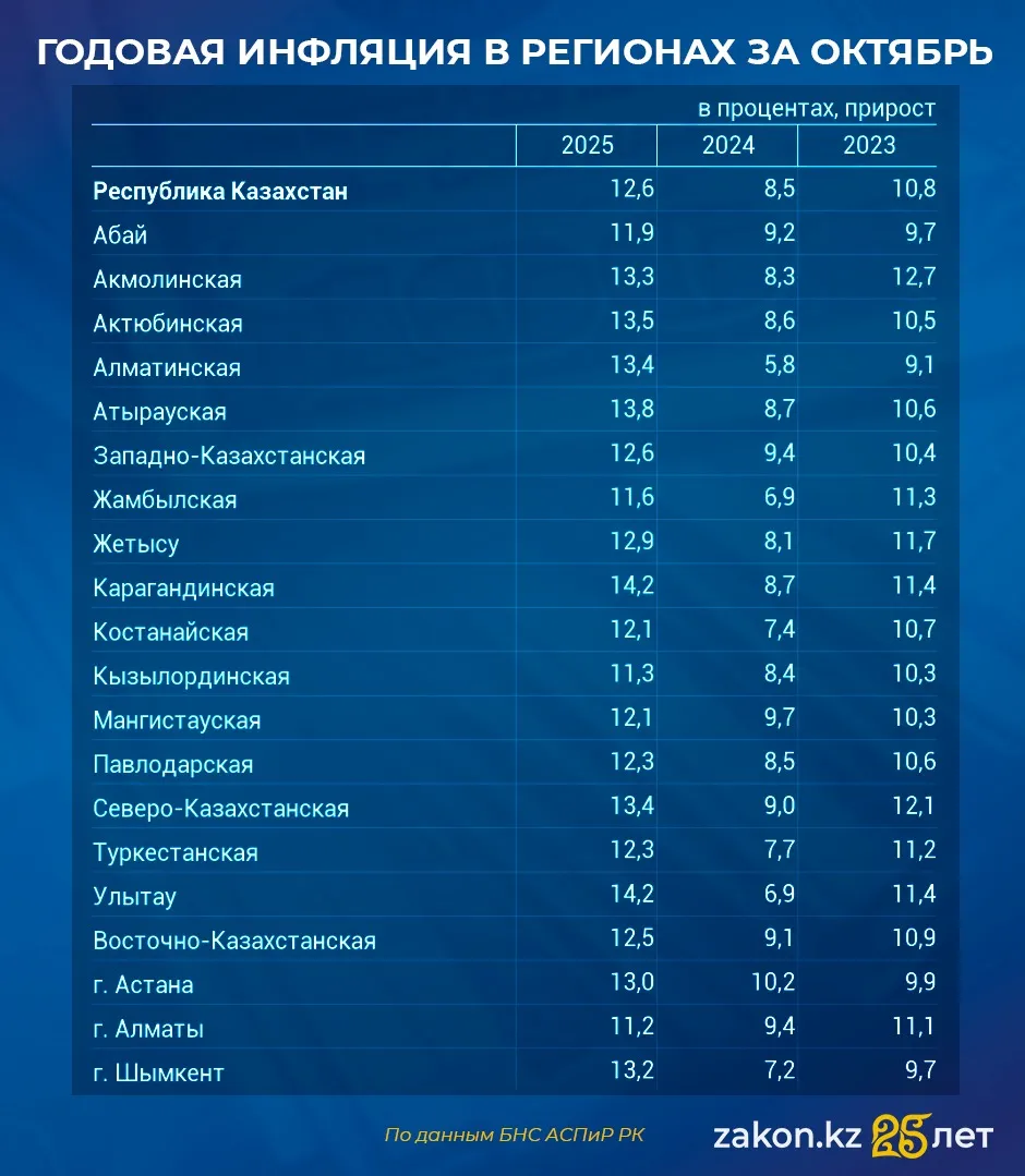 Годовая инфляция по Республике Казахстан в октябре 2025 года достигла 12,6%. Однако инфляционное давление распределено по стране неравномерно. Настоящими "чемпионами" по росту цен стали регионы с узкой промышленной экономикой: