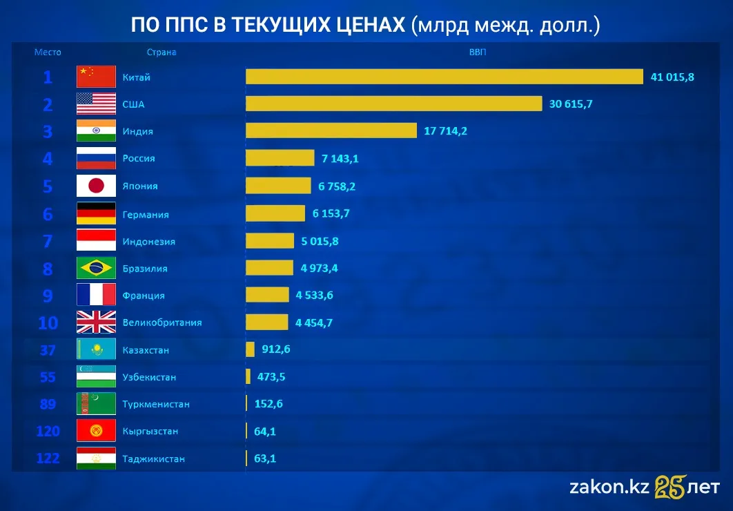 По общему размеру экономики Казахстан в 2025 году займет 50-е место в мире по номинальному ВВП (300 млрд долларов). Но, как отмечают специалисты Finprom.kz, по ППС республика поднимается на 37-е место (912,6 млрд международных долларов). Эта большая разница в три раза отражает более низкий уровень цен в РК по сравнению с многими развитыми странами.