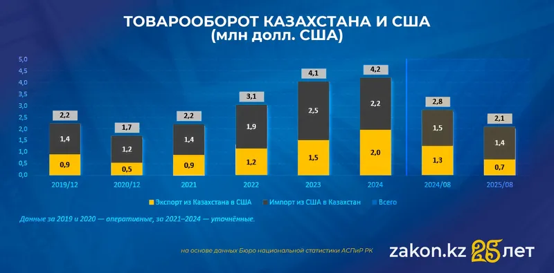 Однако в текущем году наблюдается спад. За январь-август 2025 года товарооборот составил 2,1 млрд долларов США, что на 25,8% меньше, чем за тот же период 2024 года. Этот тренд, отмечают аналитики, отражает общую тенденцию снижения экспортных доходов Казахстана, а не только особенности торговли с США.