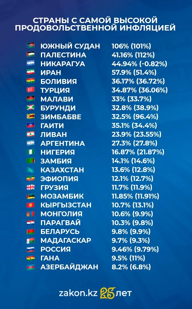 Лидеры антирейтинга (самая высокая инфляция). На вершине списка, предоставленного экономистом Эльдаром Шамсутдиновым, находятся страны, переживающие острые экономические или геополитические кризисы. Южный Судан занимает первое место с годовым ростом цен на продовольствие в 106%. В этой же группе находятся Иран (57,9%), Никарагуа (44,94%) и Палестина (41,16%). Здесь рост цен означает стремительное снижение покупательной способности населения и угрозу продовольственной безопасности.
