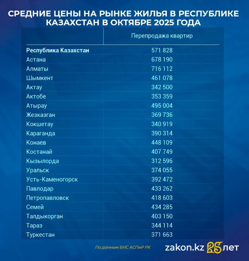 Самые высокие средние цены традиционно зафиксированы в Алматы (716 112 тенге) и Астане (678 190 тенге). Это подтверждает статус этих городов как основных центров притяжения инвестиций и рабочей силы. Самые доступные квартиры на рынке перепродажи находятся в Кызылорде (312 596 тенге) и Актау (342 500 тенге).
