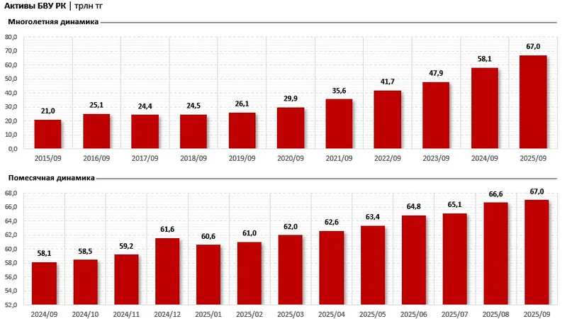 Для справки: в годовой динамике совокупные активы БВУ РК увеличились на 15,4%, за пять лет – в 2,2 раза, а за десятилетие – сразу в 3,2 раза.