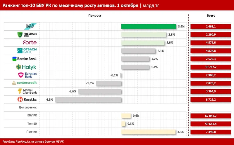 По месячному росту активов среди крупнейшей десятки уверенно лидирует Bank RBK: плюс 3,4%, до 2,5 трлн тенге. В годовой динамике показатели банка увеличились уже на 13,1%.