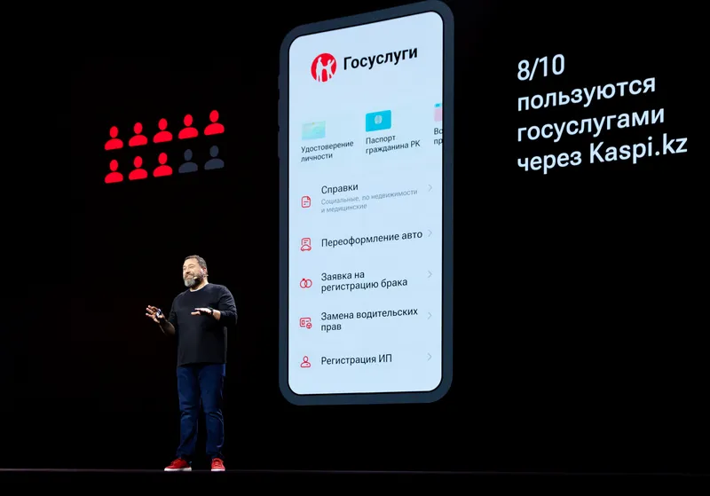 "Госуслуги – это, я считаю, наша совместная с вами гордость. Все, что мы с вами сделали совместно с государственными ведомствами и с министерствами, – это совершенно уникальный пример. Нигде в мире нет такого, чтобы ты мог переоформить автомобиль или продать, перерегистрировать его, сидя за чашкой чая со своим другом. Это просто нереально. У нас есть цифровые документы, которые мы делаем вместе с госорганами, у нас есть переоформление автомобиля – это самые популярные сервисы. У нас есть замена удостоверения – это вообще гениальный опыт, когда ты можешь прямо в своем приложении сам себя сфотографировать и получить удостоверение личности. Сколько здесь присутствующих пользуются госуслугами? 8 из 10 казахстанцев пользуются госуслугами на Kaspi.kz!"