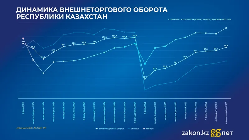Согласно данным Бюро национальной статистики АСПиР РК, общий объем товарооборота Казахстана за 9 месяцев 2025 года составил 103,4 миллиарда долларов, сократившись на 1,1% относительно показателей прошлого года.