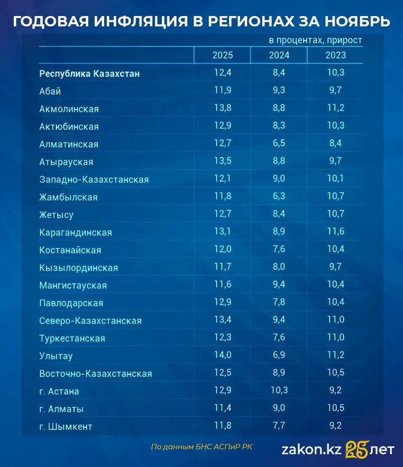 По данным Бюро национальной статистики АСПиР РК, средний показатель инфляции по стране на 1 декабря 2025 года – 12,4%, что выше прошлогодней динамики ровно на 4%.