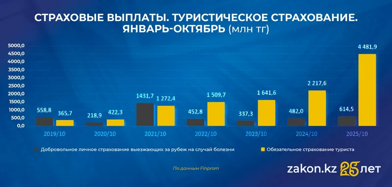Общие поступления за январь-октябрь 2025 года достигли 11,8 миллиарда тенге (+15,6% за год). При этом, по подсчетам специалистов портала Finprom, доля туристического страхования на общем рынке второй год подряд составляет лишь 0,8%, что подчеркивает нежелание казахстанцев добровольно защищать себя при выезде за рубеж.