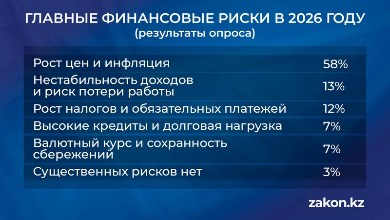Опрос, проведенный экономистом Русланом Султановым, подтверждает, что в 2026 году главной угрозой для личных финансов остается не безработица, а обесценивание доходов. Структура опасений выглядит так:
