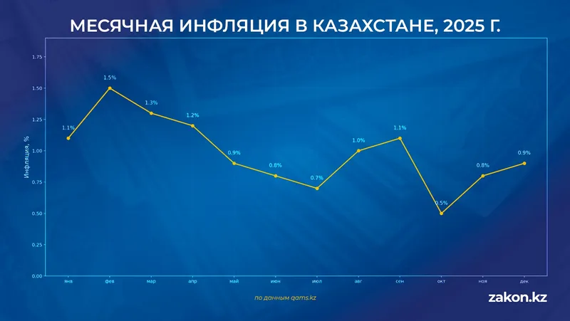 Если посмотреть на 2025 год в разрезе месяцев, картина выглядит не менее показательно. Пик месячной инфляции пришелся на февраль – 1,5%, март – 1,3% и апрель – 1,2%. Минимальное значение было зафиксировано в октябре – 0,5%.