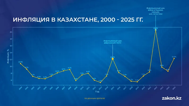 По расчетам ассоциации QAMS (некоммерческая организация "Казахстанская Ассоциация Миноритарных Акционеров"), медианная инфляция в Казахстане за 2000–2025 годы составила около 7,75% в год, тогда как средняя арифметическая – примерно 8,4%.