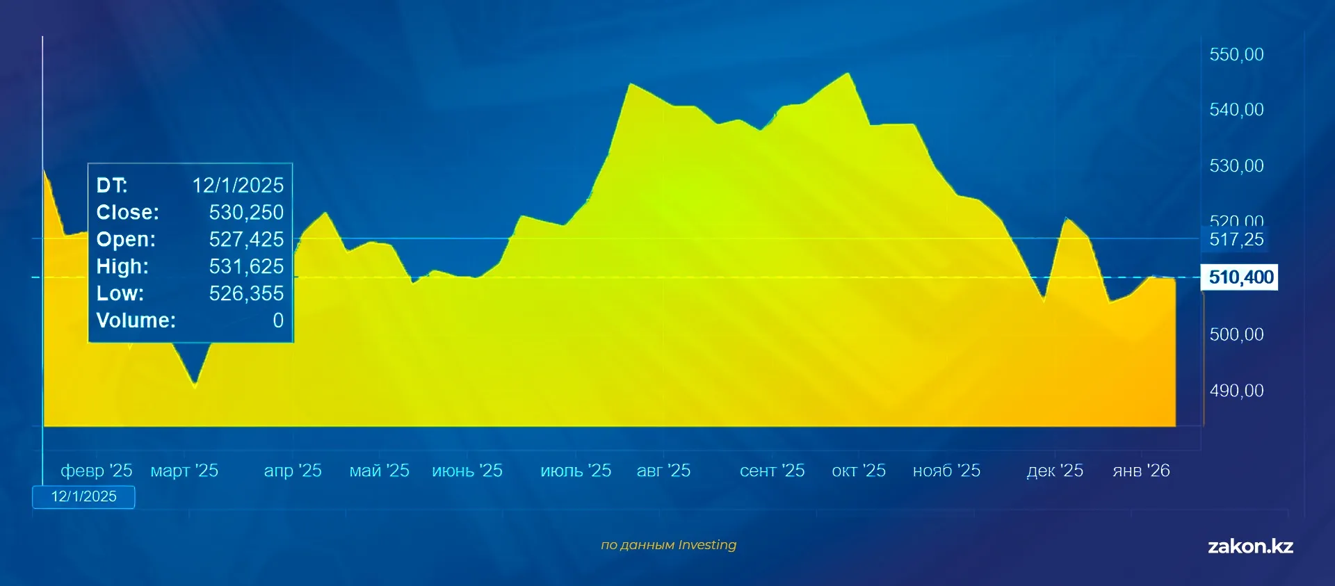 Общая амплитуда колебаний составила 7,3 тенге. Средний курс за четыре торговых дня сформировался на уровне 509,88 тенге, что свидетельствует о балансе спроса и предложения без резких ценовых импульсов.