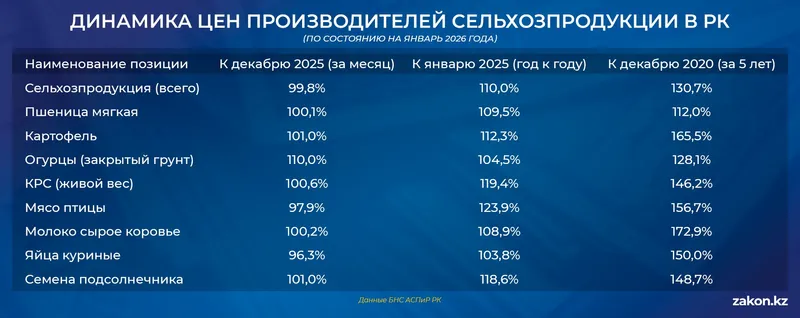 Несмотря на текущее охлаждение рынка, годовые и пятилетние показатели подчеркивают масштаб пройденной продовольственной инфляции. По данным БНС АСПиР РК, к январю 2025 года цены производителей выросли на 10%, а за пятилетний период (с декабря 2020 года) общий рост составил 30,7%.