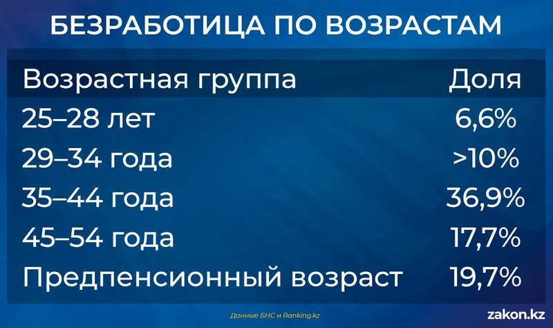 Но низкие цифры не снимают проблем, а, наоборот, создают новые. Если посмотреть на данные БНС АСПиР РК по безработице, то становится ясно: это уже не проблема молодежи, впервые выходящей на рынок. Самая крупная группа незанятых – люди в возрасте 35-44 лет (36,9%). Еще 17,7% приходится на возраст 45-54 года, а 19,7% – на предпенсионную категорию.