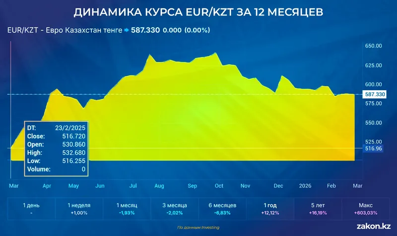 За год евро подорожал с 525 до 586 тенге. Это рост примерно на 11,6%. Доллар за тот же период, наоборот, снизился на 1%: с 502,47 тенге 24 февраля 2025 года до 497,33 тенге сегодня.