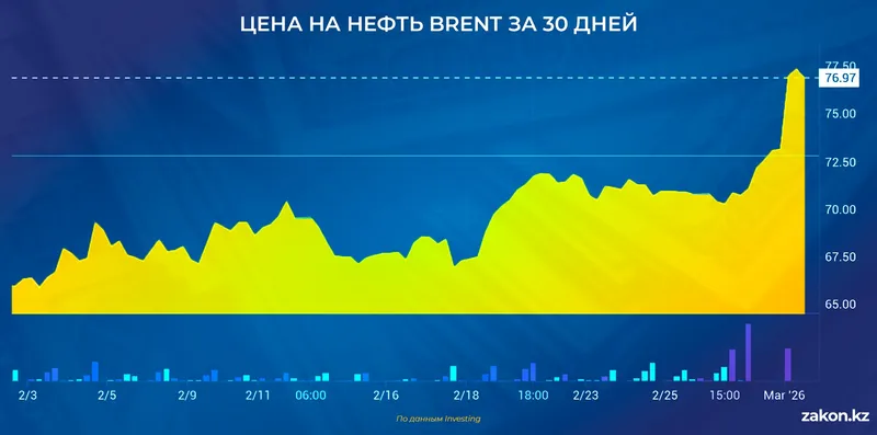 Вчера вечером в моменте стоимость барреля достигала 82,37 доллара. К 6:00 утра по времени Астаны – то есть через несколько часов после открытия азиатской сессии – рост замедлился до 8,93%, и цена составила 79,38 доллара за баррель. Позже котировки откатились к 77-78 долларам. Таким образом, рынок за несколько часов прошел диапазон более 6 долларов – это крайне высокая внутридневная амплитуда.