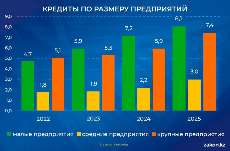 Объем кредитов малому бизнесу достиг 8,1 трлн тенге, или 43,7% всего портфеля. Крупные предприятия аккумулировали 7,4 трлн тенге, что соответствует 40,1%, а средние – 3 трлн тенге, или 16,1%.