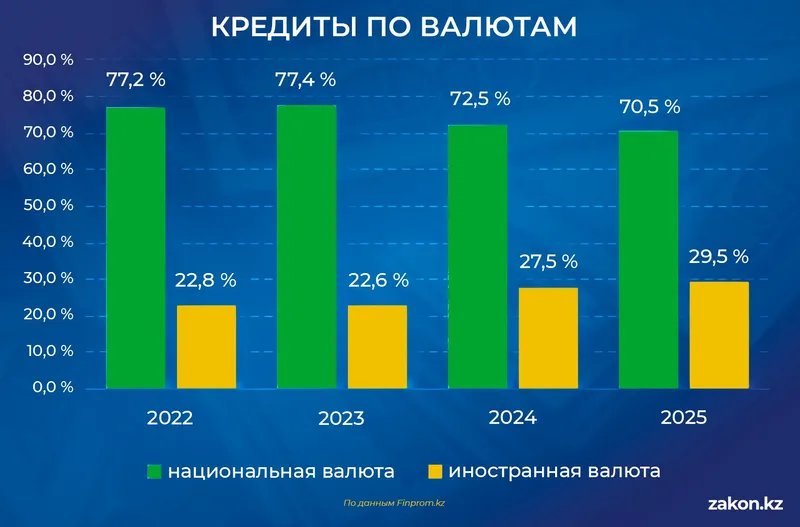 Отдельного внимания заслуживает рост инвалютных займов. Их доля увеличилась с 22,8% в 2022 году до 29,5% к концу 2025-го, а объем портфеля вырос за этот же период с 2,6 трлн до 5,5 трлн тенге. Таким образом, почти треть кредитов бизнесу сегодня выдается в иностранной валюте.
