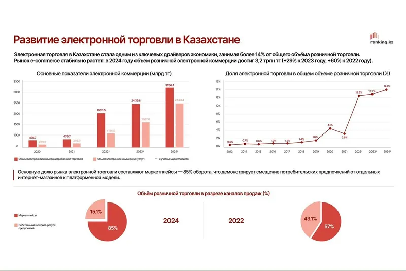 Эксперты сошлись во мнении, что отечественный e-commerce позитивно влияет на розничную торговлю, занятость, налоговые поступления, рост и масштабирование МСБ, также выступает драйвером экономики и даже оказывает дезинфляционный эффект. Результаты исследования о развитии электронной торговли в Казахстане презентовал генеральный директор Ranking.kz Седред Асретов.